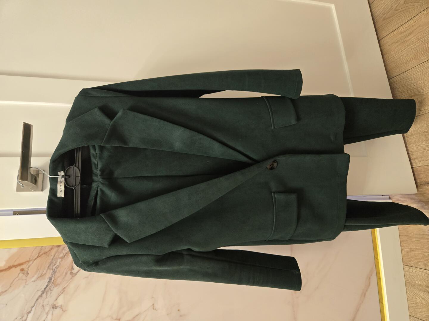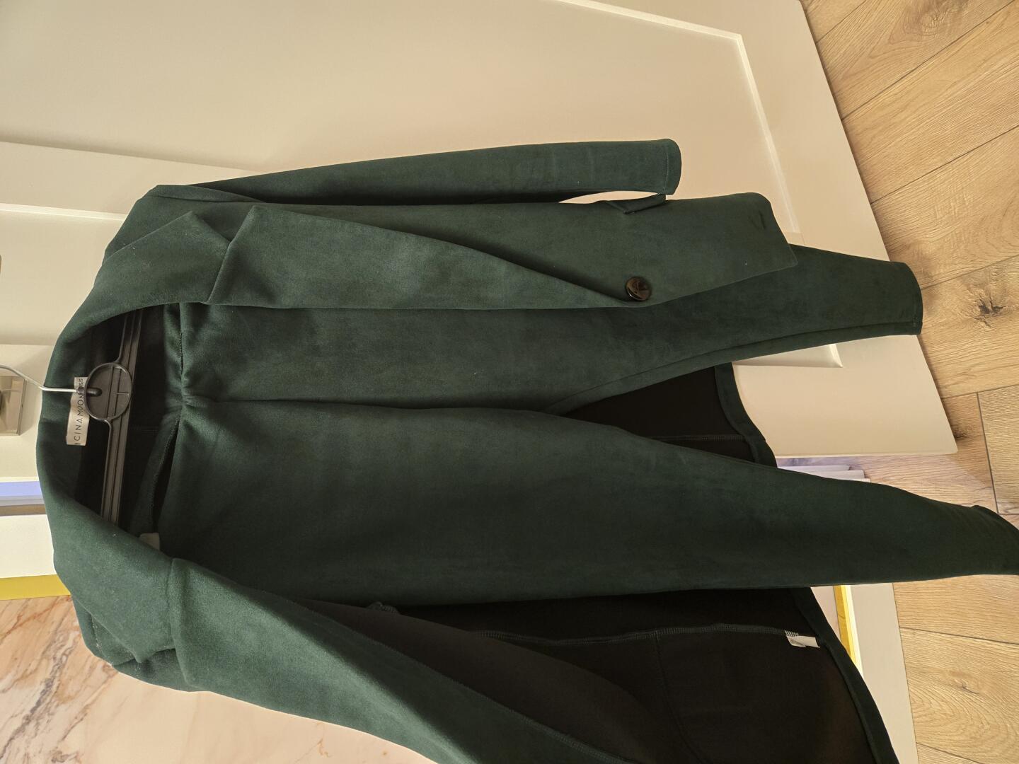 Sprzedam garnitur damski butelkowa zieleń, zamszowy. Rozmiar S. Spodnie zwezane.